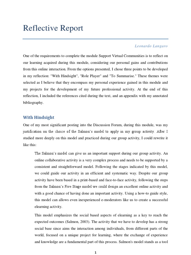 COMassignment 4-Personal Development Reflection Essay.. copy 3. Reflective Essay. University. Swinburne University of Technology. Course. Learning and Communicating Online (COM) Lecture notes WEEK 7 - Learning and Communicating Online Week 8 Reflections for week 8 rubric etc - Learning and Communicating Online Week 10activity 3/5(2) Online Learning Reflection Paper. Long term planning of details of the course tends not to be as detailed as online because other than a hard copy of the syllabus, teachers frequently do not share details of units and assignments until nearer the due date. Details of f2f lessons are planned out in detail, including content, methods to be used Reflecting on learning Students in Education are often asked to reflect on their own learning. This generally involves making connections between your own learning experiences and educational theories, as well as considering the implications for your future teaching practice. Sample of student work